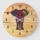 A clock with an elephant illustration with bright and bold colours with decorative floral and mandela style pattern. Wooden board (image not actual wood) background image. Art deco clock face.