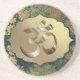 A gold, shiny om symbol inside a fancy, gold frame with a gold and yellow, green floral backdrop. Floral zen vibes.