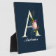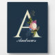 Beautiful and fancy florals include gold leaves, purple rose and blue wildflowers embellishments on large light colored letter / initial A. Dark blue background. Customize with first / last name