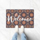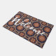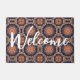A welcome doormat with a repeating pattern of decorative ornate elements in flower, star and sun shapes.