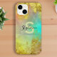 Presenting an exquisite custom iPhone case adorned with a vibrant abstract motif in shades of yellow, green, and pink. The design incorporates imitation foil and glistening gold highlights, adding a touch of opulence. A gold foil texture graces the surface, accompanied by a prominent initial letter positioned at the heart of the design. Enveloping the initial is your name, rendered in a sophisticated cursive font. Elevate the personalisation by tailoring the text to your preferences, making this case an authentic reflection of your style.