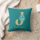 Pretty throw pillow features gold glitter letter 'J' with aqua roses and gold floral bouquet on a teal background. Personalise with name in gold coloured font.