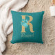 Pretty throw pillow features gold glitter letter 'R' with aqua roses and gold floral bouquet on a teal background. Personalise with name in gold coloured font.