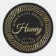 Prominent border with metallic gold gradient on black background. The word "Honey" is written in an elegant script font and the descriptive text is written in a refined serif. Choose your honey net weight from a list of pre-calculated sizes in U.S. Standard and metric weights.