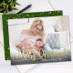 Fancy "Merry Christmas" on front in gold foil with gold foil border. Add your photo, name, year and message on back. Back has gold script text and gold stars on forest green background.