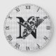 Fancy monogram / initial letter ' N ' in black silhouette on distressed grey and white harlequin background with Roman numeral clock face
