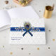 Chic white on white damask wedding guest sign in book with graphics a sheer blue ribbon, across the middle.  Graphics of a fancy silver and pearl flourish, on the front of the guest book, has a peacock feather and blue satin looking bow decorating the middle.  Personalise the text for your special day.