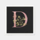Fancy pink glitter letter D with gold leaves and swirls overlay and a coppery butterfly on black background.