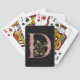 Fancy pink glitter letter D with gold leaves and swirls overlay and a coppery butterfly on grey background.
