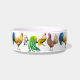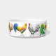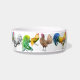 Original fine art design of fancy roosters by artist Carolyn McFann of Two Purring Cats Studio printed on a quality pet food bowl for chicken fans.