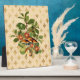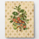 Vintage woodland botanical illustration of mushrooms, flowers and a variety of leaves on a creamy peach and gold harlequin background.