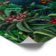 Fantastic fabulous mysterious midnight rainforest tropics design with green tropical leaves, butterflies and red and pink tropical flowers.