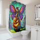This shower curtain has a weird pumpkin fantasy art pictured on it.