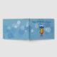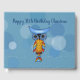 This custom guest book for your party or celebration has a fantasy owl with a blue head, yellow body and colourful wings and tail with big round blue eyes on a blue background with circles and dashes. Customise your information with the template.