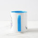 This coffee or tea mug is circled with brightly coloured crescent moons with abstract shapes in circles and triangles in blue and yellow, a purple scroll, and smiling faces.