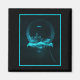 A giant snowglobe crystal ball with a turquoise blue metropolitan cityscape inside. A blimp flying above the city adds interest and personality. The globe sits on an icy pedestal. Cool fantasy design in black and turquoise blue. The setting has a icy yet tranquil feel.