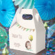Adorable kid's birthday thank you favour box featuring a cute cheerful hedgehog holding a balloon with party flag background.