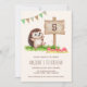 Adorable kid's birthday invitations featuring a cute cheerful hedgehog, green grass and colourful mushroom on the floor, party flag and a wooden board with the number.