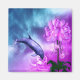 This design features a blue bottle nosed dolphin diving into a bold pink and blue pool of water along with a gorgeous blue sky and pretty pink and green flower.