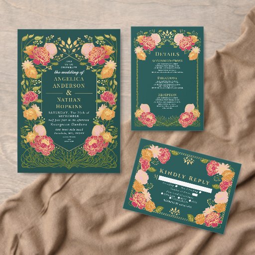 Elegant, whimsical, Fantasy Enchanted Floral Garden wedding design perfect for either an enchanted forest-themed celebration. This design features floral elements in a frame of green leaves, and gold accents. Matching items in our shop for a complete party theme.