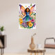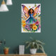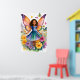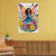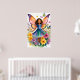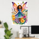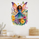 Poster of a young girl with vibrant butterfly wings surrounded by colourful flowers, exuding a sense of magic and whimsy. Her dress mirrors the hues of her wings, matching the bright butterflies fluttering around her.
