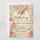 Fantasy floral 50th birthday invitation with red and pink roses and blue flowers on a vintage-themed paper background. Custom template you can personalise with your party or celebration details.