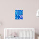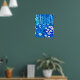 Poster in a semi-abstract illustration of a fantasy forest with flowers, foliage, trees and birds, in shades of cobalt blue and white