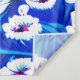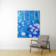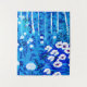 Tapestry in a semi-abstract illustration of a fantasy forest with flowers, foliage, trees and birds, in shades of cobalt blue and white