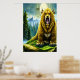 Large fantasy golden sabertooth bear with scary eyes and sharp teeth sitting in the forest. This is a AI generated art.