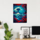 A vibrant fantasy artwork inspired by the classic Great Wave, reimagined with bold blue waters, cherry blossom trees in fiery red, and a distant view of Mount Fuji. This powerful blend of Japanese tradition and fantasy style makes a striking piece for lovers of Japanese art, ocean themes, and dramatic landscapes.