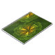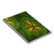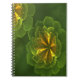 Notebook original digital artwork with inspired fractal shapes that look like abstract, surreal flowers. The flowers design is somehow geometrical with sharp zig-zag petals outline and discreet angles on the petals surface architecture. These flower-like shapes are placed in front of a background digitally created as well with thin clouds that reflect a faded yellow, warm light.The composition is made in shades of green, yellow and orange where the greens are dominating the image while the yellows make the warm and glowing atmosphere.