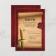 Fantasy knight's sword Jewish Bar Mitzvah rsvp card. This mediaeval times fantasy sword and sorcery Bar Mitzvah reply card features a red velvet look background, a simulated parchment scroll, a knight's, king's, or prince's sword, and a wax seal with a subtle Jewish Star of David.