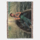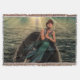 This blanket depicts a fantasy image of a mermaid riding in a canoe with the sun's rays behind her.
