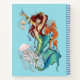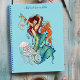 An auburn-haired mermaid with a teal tail, gracefully poised against a light blue backdrop. Surrounding her are blue water bubbles In front of her, a jellyfish in light pink and white, while a large orange seahorse floats beside her, adding a splash of vibrant contrast. From her outstretched right hand, seashells and a pearl necklace tumble downward. Adorned with shimmering gold bracelets