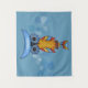This wall tapestry is blue with geometric circles and dashes and a fantasy owl that has a blue head, round blue eyes, yellow body and colourful feathers and tail.