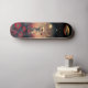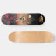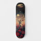 Cyber fantasy art skateboard. A surreal digital artwork depicting an robotic cat with humanlike features, floating above red and pink flowers in the foreground of space. Above them is another planet visible through thin clouds, while two small flying saucers drift. The background includes dark skies, creating contrast between light and shadow.