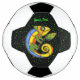 This soccer ball is black with bright green dots and a fantasy smiling lizard holding a twig with a leaf. The lizard is in bright colours of yellow, orange, green, and blue. Customise your text with the template.