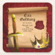 Fantasy sword and crown Jewish Bar Mitzvah personalised paper coasters. This mediaeval times fantasy sword and sorcery Bar Mitzvah paper coaster features a red velvet look background, a simulated parchment scroll, a king's or prince's crown, a sword, and a wax seal with a subtle Jewish Star of David.
