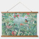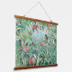 This composition depicts a fantastic tropical forest with green tropical plants and thickets, bright pink, red and orange large flowers and butterflies.