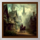 Step into a world of fantasy and wonder with our latest design of a fantasctical view of Victorian England. This stunning image captures the Gothic architectural style of the mediaeval town, with its pointed arches, steeples, and spires. The dark, weathered stone buildings create a moody and atmospheric backdrop for the horse-drawn carriage in the foreground, driven by a man in a top hat. The overcast sky adds to the gloomy mood of the image, creating a sense of mystery and intrigue.