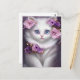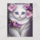 Fantasy digital portrait of a white kitten with big and beautiful blue eyes surrounded by purple flowers.
