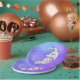 This paper plate has a fantasy white crescent moon with a face and fancy colourful abstract markings of various shapes in purple, blue, and yellow on a mixed purple and blue sky background.
