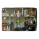 A young male wizard holding an old book that has a small cute green dragon sitting atop the book. In behind them is a library filled with books, potions, cauldron, crystal ball and plants