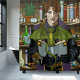 A young male wizard holding an old book with a cute small green dragon atop of the book. In behind them is a library filled with books, potions, cauldron, crystal ball and plants