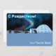 A digital painting featuring an igloo on the polar ice pack, sled dogs and a man in a parka. The northern lights glow overhead. Cyrillic (Russian) text reading "S Rozhdestvom" (С Рождеством - A Russian Christmas greeting) appears in glowing blue and white. Add your own additional text.