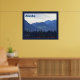 Blue mountains, blue lake water, dark green trees, pink fireweed, and overcast. A depiction of summer in the far north. Text reading "Alaska" also appears. Mosquitos not included.