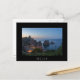 Postcard of the big Faraglioni rocks in the water of the Mediterranean Sea and the old red Tonnara, tuna factory in Scopello, at the north coast of Sicily, Italy at the Blue Hour of dusk with a black border and the text 'Sicily'.