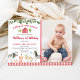 This cute birthday invitation features watercolor farm animals with greenery floral accents, confetti and a red gingham border.