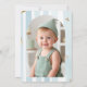 Celebrate your little one’s first year with this adorable farm-themed birthday invitation! The front features a charming watercolor cow in a party hat with golden confetti, perfect for a sweet barnyard bash. On the back, your child's photo is framed by soft blue and white stripes with glitter-style heart accents, adding a personal and playful touch.