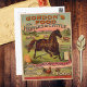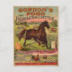 Beautiful horse with "Gordon" on top of it in a grassy corral with farm animals in the background. "Gordon's Food for horses & cattle" ad, with a second ad underneath for poultry food. Rustic, country nostalgia theme with full colour.